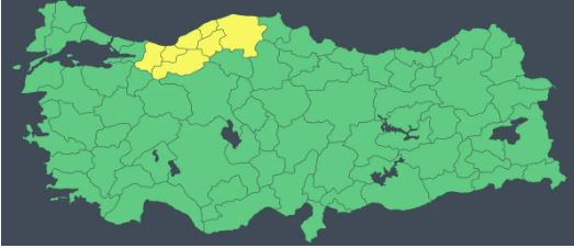Sarı uyarı verilen iller Bartın, Bolu, Düzce, Karabük, Kastamonu, Sakarya ve Zonguldak olarak sıralandı.