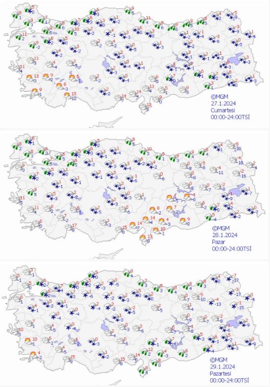 Kıyılarda yağmur ve sağanak, iç kesimlerde karla karışık yağmur ve kar şeklinde olması beklenen yağışların Doğu Karadeniz kıyı illeri ile Bolu, Zonguldak, Bartın ve Düzce'de, Güneydoğu Anadolu'nun doğusu, Doğu Anadolu'nun güneydoğusu ile Bingöl ve Muş çevrelerinde kuvvetli olması bekleniyor. Gece ve sabah saatlerinde pus ve yer yer sis ile birlikte iç ve doğu bölgelerde buzlanma ve don olayı görüleceği öngörülüyor.