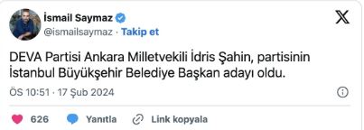 "DEVA Partisi Ankara Milletvekili İdris Şahin, partisinin İstanbul Büyükşehir Belediye Başkan adayı oldu."