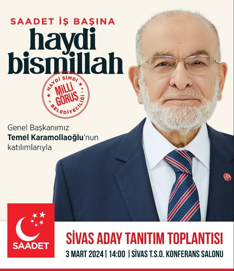 Saadet Partisi Genel Başkanı Temel Karamollaoğlu partisinin yerel seçim çalışmalarına destek vermek ve adaylarını tanıtmak için Sivas'a gelecek.