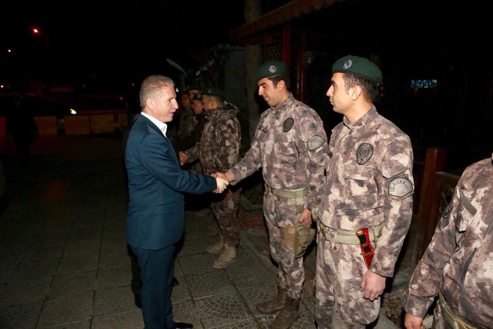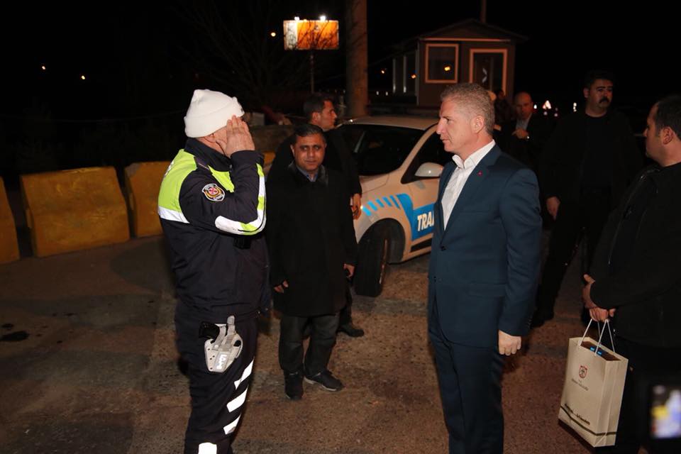 Daha sonra Vali Gül sırasıyla, yeni yılın ilk dakikalarında Özel Harekat Şube Müdürlüğünde görevli polislerle biraraya geldi ve Sivas’ı çevre illere bağlayan karayolu güzergahlarındaki uygulama noktalarını denetleyip, görevliler, araç sürücüleri ve vatandaşlara tatlı ikram etti.
