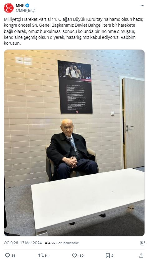 Yapılan açıklamada MHP Genel Başkanı Devlet Bahçeli'nin Omuz Burkulması yaşadığı açıklandı.