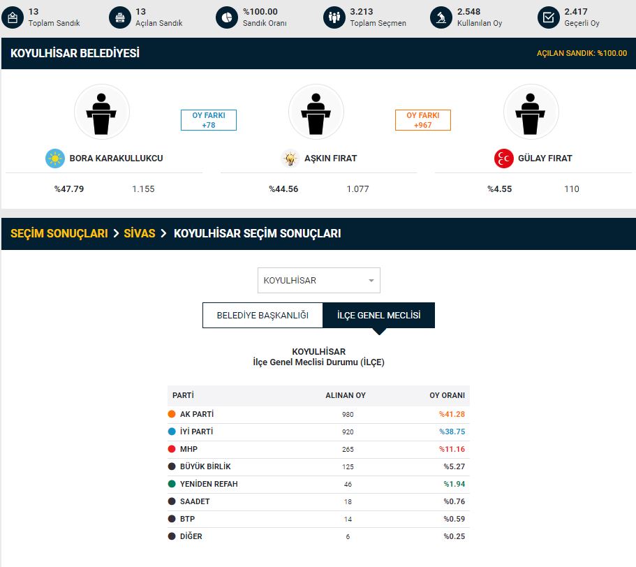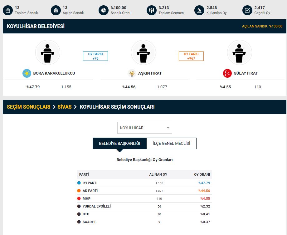 İşte 31 Mart 2024 Yerel Seçimlerinde Koyulhisar İlçesinin Başkanlık seçim sonuçları..