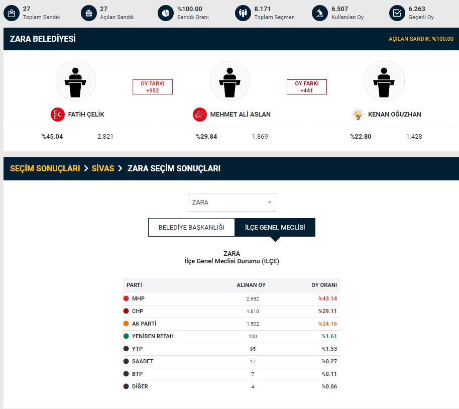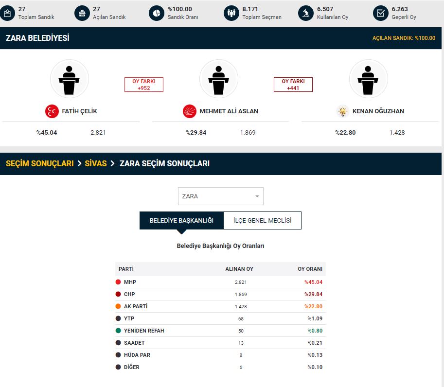 İşte 31 Mart 2024 Yerel Seçimlerinde Zara İlçesinin Başkanlık seçim sonuçları..