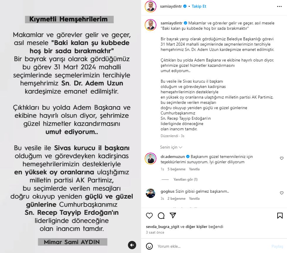 Bu vesile ile Sivas kurucu il başkanı olduğum ve görevdeyken kadirşinas hemeşehrilerimizin destekleriyle en yüksek oy oranlarına ulaştığımız milletin partisi AK Partimiz, bu seçimlerde verilen mesajları doğru okuyup yeniden güçlü ve güzel günlerine Cumhurbaşkanımız Sn. Recep Tayyip Erdoğan'ın liderliginde döneceğine olan inancım tamdır."