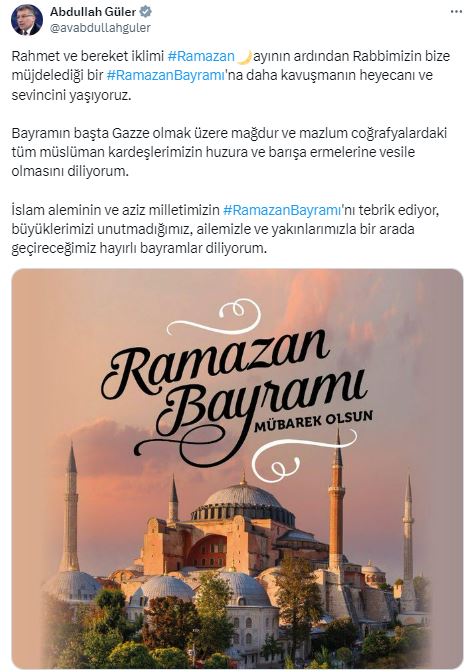 İslam aleminin ve aziz milletimizin #RamazanBayramı'nı tebrik ediyor, büyüklerimizi unutmadığımız, ailemizle ve yakınlarımızla bir arada geçireceğimiz hayırlı bayramlar diliyorum." ifadelerine yer verdi. (Halil Yavuz Canpolat)