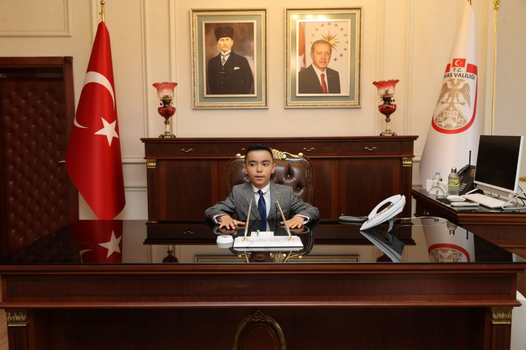 Vali Şimşek ziyarette makam koltuğunu temsili olarak 2. sınıf öğrencisi Zehra Aydoğdu ve 4. sınıf öğrencisi Hasan Eray Çiğdem'e devretti.