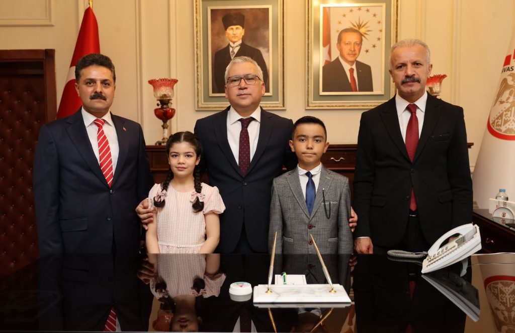 Sivas Valisi Dr. Yılmaz Şimşek, 23 Nisan Ulusal Egemenlik ve Çocuk Bayramı'nın 104. yılı münasebetiyle İl Milli Eğitim Müdürü Necati Yener, Gazi Osmanpaşa İlkokulu öğretmenleri ve öğrencilerini makamında kabul etti.