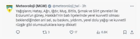 "Yağışların; Hatay, Ağrı, Iğdır, Muş, Bitlis, Şırnak ve Siirt çevreleri ile Erzurum’un güney, Hakkâri'nin batı ilçelerinde yerel kuvvetli olması beklendiğinden ani sel, su baskını, yıldırım, yerel dolu yağışı ve kuvvetli rüzgâr gibi olumsuzluklara karşı dikkat!"