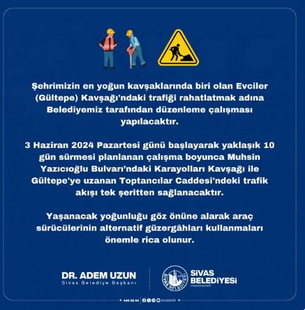 Belediye Başkanlığı tarafından yapılan paylaşımda: " Şehrimizin en yoğun kavşaklarında biri olan Evciler (Gültepe) Kavşağı'ndaki trafiği rahatlatmak adına Belediyemiz tarafından düzenleme çalışması yapılacaktır" ifadelerine yer verildi.