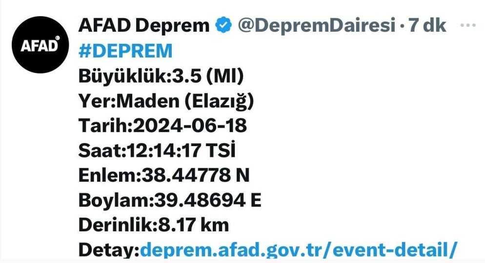 Elazığ’ın Maden ilçesinde 3.5 büyüklüğünde deprem meydana geldi.