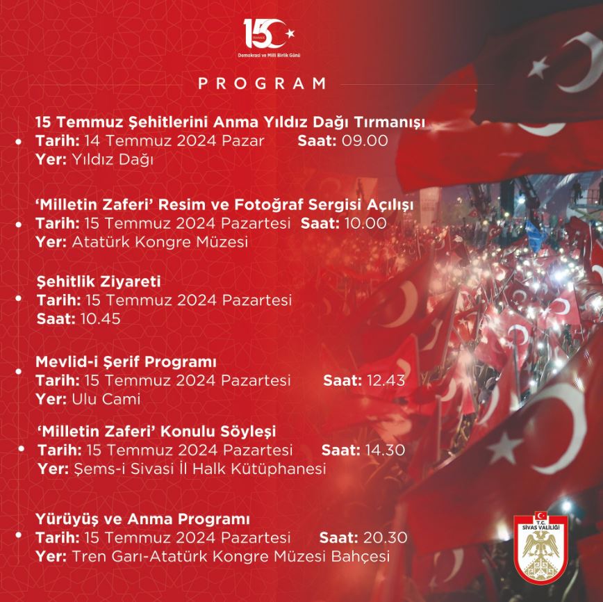 Sivas Valiliği sosyal medya hesabından "15 Temmuz Demokrasi ve Millî Birlik Günü programları"nı paylaştı.