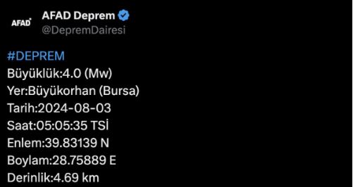 Bursa'nın Büyükorhan ilçesinde saat 05.05'te 4 büyüklüğünde deprem oldu.