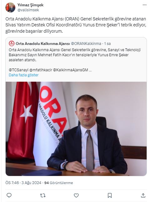 "Orta Anadolu Kalkınma Ajansı (ORAN) Genel Sekreterlik görevine atanan Sivas Yatırım Destek Ofisi Koordinatörü Yunus Emre Şeker’i tebrik ediyor, görevinde başarılar diliyorum." ifadelerine yer verdi.