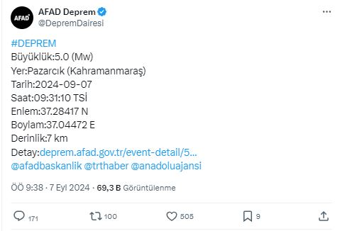 Son dakika haberine göre Kahramanmaraş'ın Pazarcık ilçesinde 5 büyüklüğünde deprem oldu.