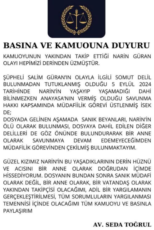 Narin Güran'ın tutuklu amcası Salim Güran'ın avukatı Seda Toğrul, kendisinin de bir anne olduğunu belirterek davadan çekildiğini duyurdu..