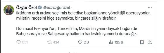 Cumhuriyet Halk Partisi Genel Başkanı Özgür Özel sosyal medya hesabından yaptığı paylaşımla Van Bahçesaray Belediyesi'ne kayyum atanmasına, "İktidarın ardı ardına seçilmiş belediye başkanlarına yönelttiği operasyonlar, milletin iradesini hiçe saymaktır, bir çaresizliğin itirafıdır.Dün nasıl Esenyurt'un, Tunceli'nin, Mardin'in yanındaysak bugün de Bahçesaray'ın ve Bahçesaray halkının iradesinin yanında duracağız" sözleriyle tepki gösterdi.