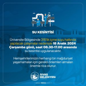 Sivas'ta üniversite bölgesinde yarın su kesintisi yapılacak.