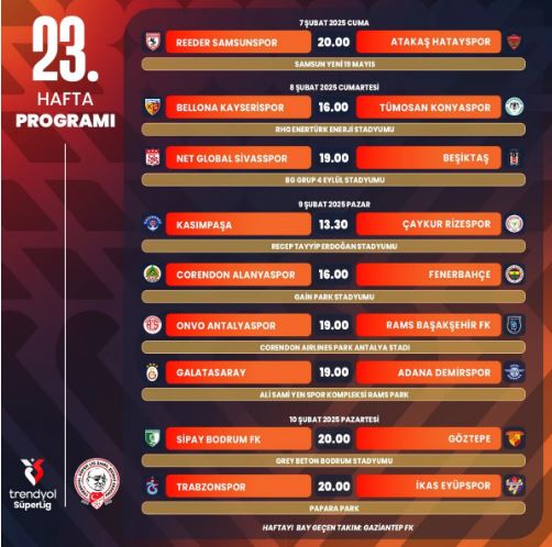 Süper Lig Şamil Ekinci Sezonu'nda 23. hafta müsabakalarına ilişkin program açıklanmıştır. Program, UEFA Avrupa Ligi'nde mücadele eden temsilcilerimizin muhtemel Play-Off müsabakaları ve Türkiye Kupası Grup Aşaması 2. hafta müsabaka takvimi dikkate alınarak planlanmıştır.