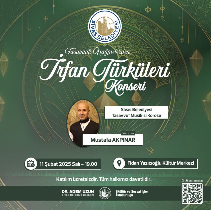 "Tasavvufî Nağmelerden İrfan Türküleri" adlı konser, Sivaslılara manevi bir atmosfer sunacak.