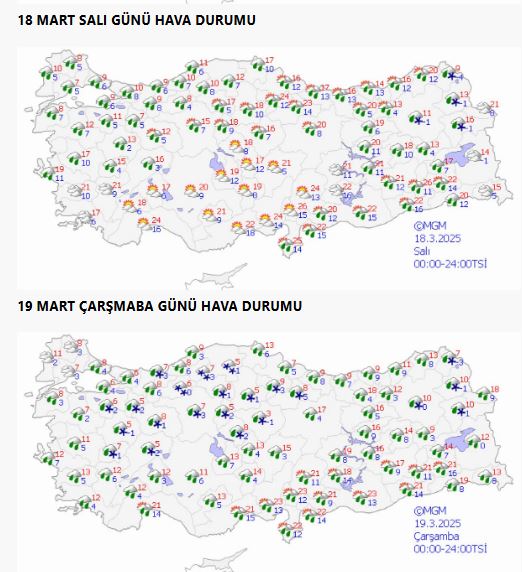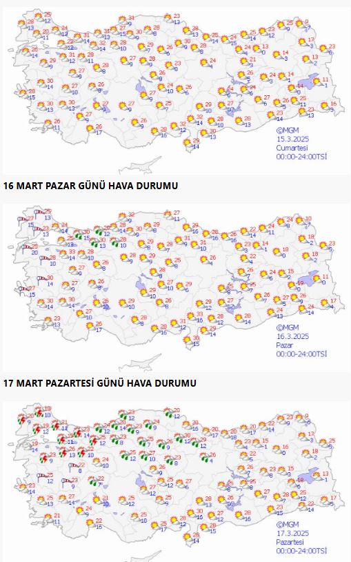 Meteoroloji Genel Müdürlüğü'nün son tahminlerine göre, 15 Mart Cumartesi günü ülke genelinde yağış beklenmiyor. Ancak hava sıcaklıkları halen mevsim normallerinin üzerinde seyretmeye devam edecek.