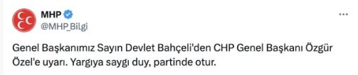 MHP'nin resmi sosyal medya hesabından yapılan paylaşımda, Özgür Özel’e yönelik uyarı niteliğinde bir açıklama yer aldı. Açıklamada, “Genel Başkanımız Sayın Devlet Bahçeli’den CHP Genel Başkanı Özgür Özel’e uyarı. Yargıya saygı duy, partinde otur.” ifadeleri kullanıldı.