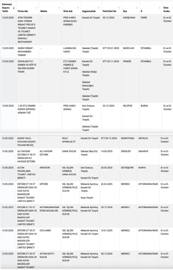 Bakanlık verilerine göre özellikle sucuk ürünlerinde ciddi ihlaller gözlemlendi. İşte tespit edilen bazı markalar ve ihlaller: