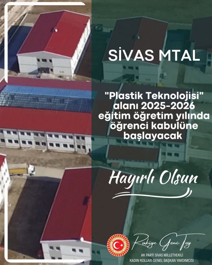 AK Parti Sivas Milletvekili Rukiye Toy, sosyal medya hesabından yaptığı açıklamayla, Sivas Mesleki ve Teknik Anadolu Lisesi bünyesinde "Plastik Teknolojisi" alanının açıldığını duyurdu.