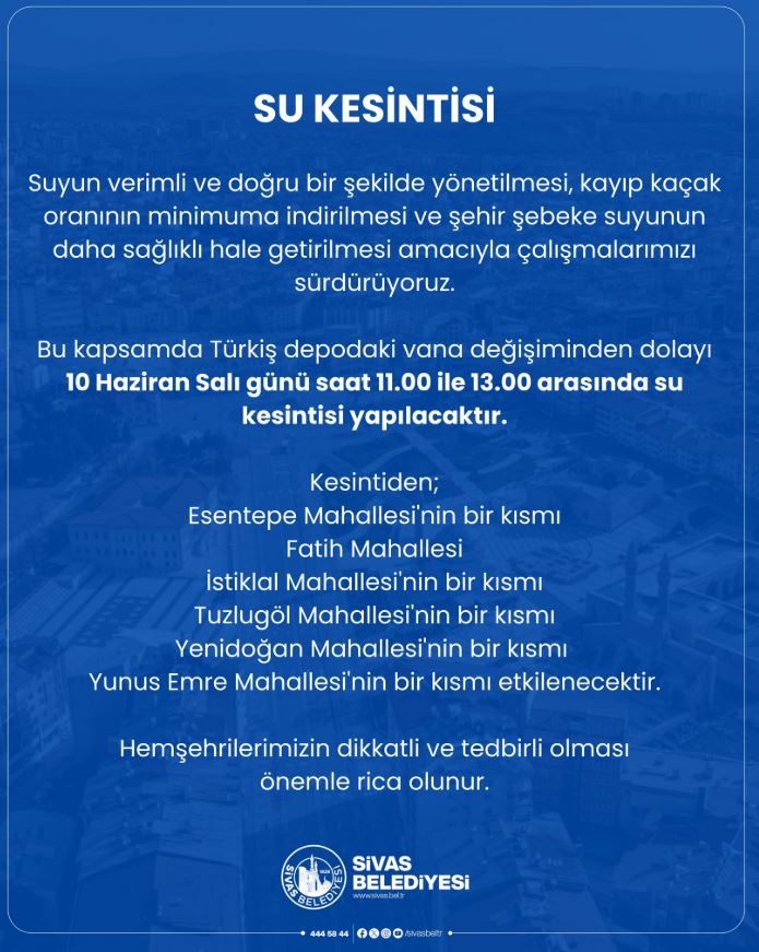 Sivas Belediyesi, vatandaşların kesinti süresince gerekli önlemleri almasını ve tedbirli olmalarını önemle rica etti.