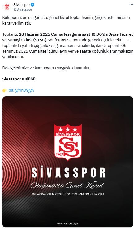“Kulübümüzün olağanüstü genel kurul toplantısının gerçekleştirilmesine karar verilmiştir. Toplantı, 28 Haziran 2025 Cumartesi günü saat 16.00’da Sivas Ticaret ve Sanayi Odası (STSO) Konferans Salonu’nda yapılacaktır. İlk toplantıda yeterli çoğunluk sağlanamaması halinde, ikinci toplantı 05 Temmuz 2025 Cumartesi günü, aynı yer ve saatte çoğunluk aranmaksızın yapılacaktır. Delegelerimize ve kamuoyuna saygıyla duyurulur.”