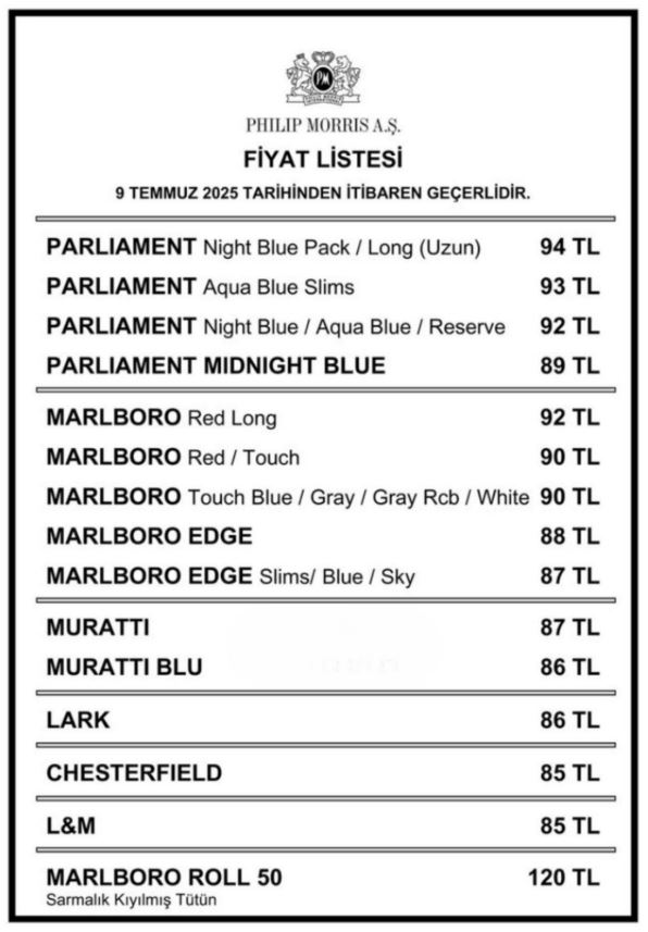 Philip Morris A.Ş. bünyesinde bulunan sigara markalarına 9 Temmuz 2025 tarihinden itibaren geçerli olmak üzere zam geldi. Yeni fiyat listesine göre sigaralarda 2 ila 5 TL arasında artış yaşandı.