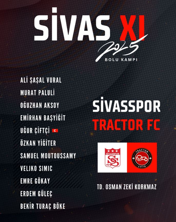2025-2026 sezonu hazırlıklarını Bolu’da sürdüren Sivasspor’un Tractor FC ile oynayacağı hazırlık maçı öncesinde ilk 11’i açıklandı.