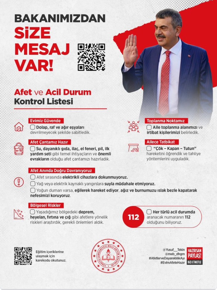 Bakan Yusuf Tekin’in video mesajını içeren Afet ve Acil Durum Kartı, tüm velilere basılı veya dijital ortamda ulaştırılacak. Velilerin kart üzerindeki kontrol listesine göre evlerinde afet hazırlığı yapmaları ve bu hazırlıkları sosyal medyada belirlenen etiketlerle paylaşmaları teşvik edilecek.