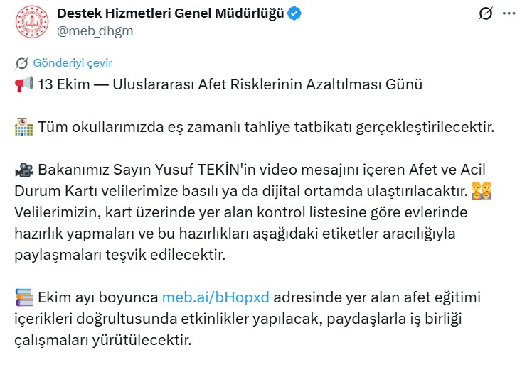 Milli Eğitim Bakanlığı, 13 Ekim Uluslararası Afet Risklerinin Azaltılması Günü dolayısıyla tüm okullarda eş zamanlı tahliye tatbikatı gerçekleştirileceğini duyurdu.