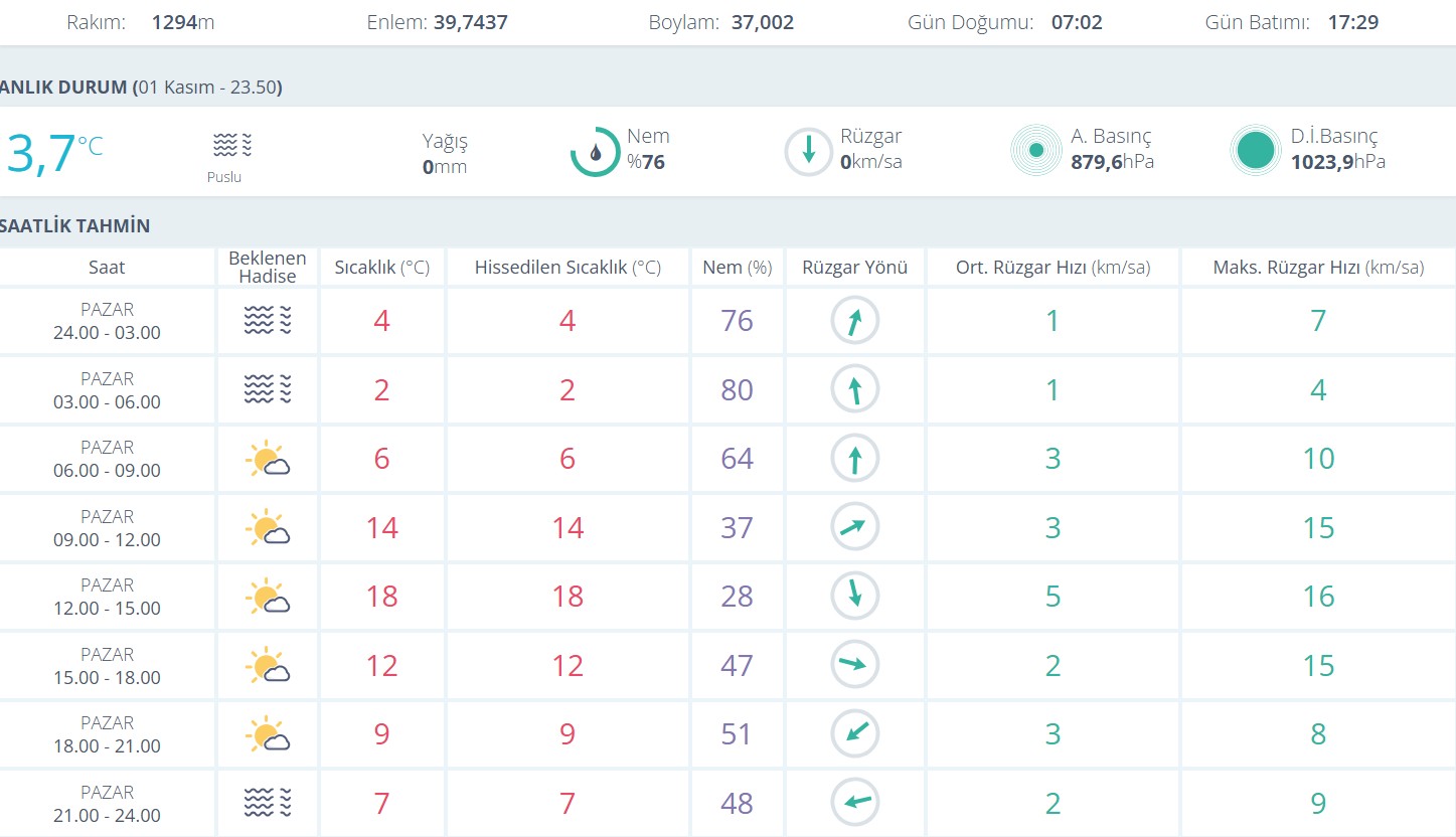 1 Kasım gecesi ölçümlere göre kentte sıcaklık 3,7 dereceye kadar gerilerken, nem oranı yüzde 76 olarak kaydedildi. Pazar sabahı saat 03.00’e kadar puslu bir hava hâkim olacak. 06.00’dan sonra sıcaklık 6 dereceye yükselecek ve bulutlar dağılmaya başlayacak.
