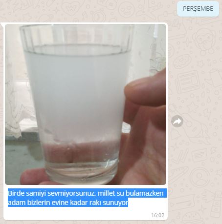 En son konuyla ilgili bir vatandaş WhatsApp hattımız üzerinden ulaştırdığı mesajında "Birde samiyi sevmiyorsunuz, millet su bulamazken adam bizlerin evine kadar rakı sunuyor" şeklinde mesaj göndererek tepkisini bu yolla dile getirmemizi istiyor.