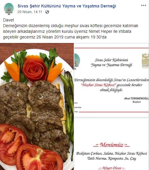 Sosyal medya hesaplarından Şehir Kültürünü Yayma ve Yaşatma Derneği, "Davet - Derneğimizin düzenlemiş olduğu meşhur sivas köftesi gecemize katılmak isteyen arkadaşlarımız yönetim kurulu üyemiz Nimet Heper ile irtibata geçebilir gecemiz 26 Nisan 2019 cuma akşamı 19 30'da" mesajını paylaşırken,