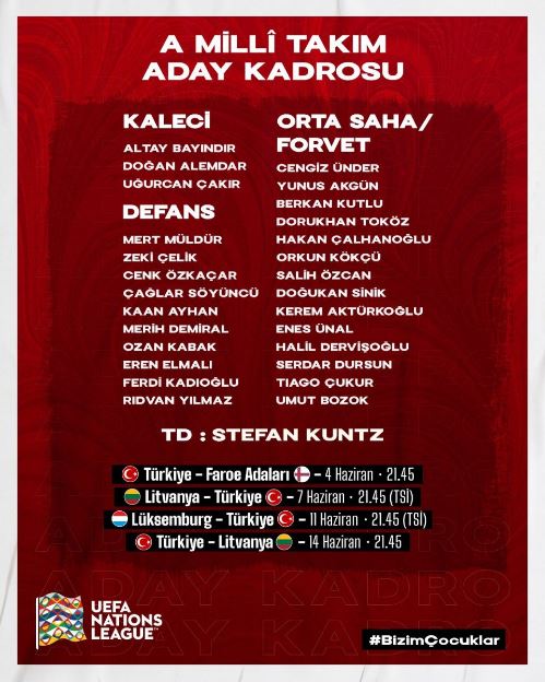 A Milli Futbol Takımı'nın, Haziran ayındaki Uluslar Ligi maçlarının aday kadrosu açıklandı.