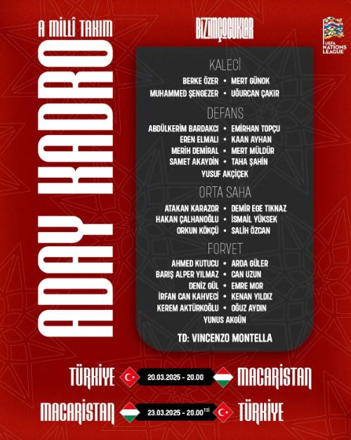 A Milli Futbol Takımı'nın UEFA Uluslar Ligi Play-Off turunda Macaristan ile 20 ve 23 Mart tarihlerinde oynayacağı karşılaşmaların aday kadrosu açıklandı.