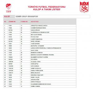 Türkiye Futbol Federasyonu (TFF), resmi internet sitesinden kulüplerin birinci transfer tescil dönemi sonrası 'Resmi A Takım Oyuncu Listeleri'ni yayımladı. Sivasspor’un kadrosunda 15 yabancı futbolcu bulunuyordu. Kırmızı-beyazlılar, 20 yaşındaki Sırbistanlı orta saha oyuncusu Armin Derlek’i, sezonun ilk yarısı için verilen listeye dahil etmedi.