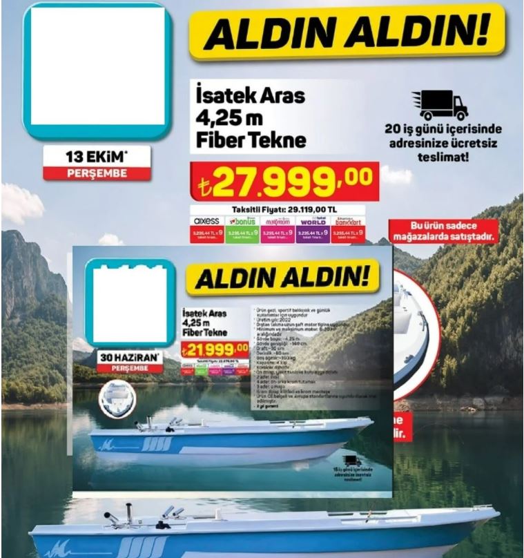 20 iş günü içerisinde adrese ücretsiz teslimat edilecek teknenin fiyatı ise 27 bin 999 TL olarak belirlendi. Market aynı tekneyi haziran ayında 21 bin 999 TL fiyat etiketi ile satıyordu. Geçen 4 aylık sürede teknenin fiyatı yüzde 27 arttı. Öte yandan bu markanın kendi sitesinde de KDV hariç 26 bin TL gibi bir tutara satılıyor.-cumhuriyet