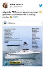 Farklı ürünlerle karşımıza çıkan A101’in yaklaşık 80 bin liraya tekne satmaya başlaması sosyal medyada gündem oldu. Birçok kullanıcı, dev mağazanın bu tarz bir ürün satmasıyla ilgili düşüncelerini dile getirdi.
