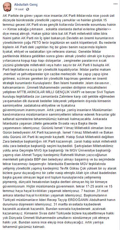 "AK Parti'de de görev yapan nice insanlar, AK Parti iktidarında nice çoook üst düzeyde bürokraside yöneticilik yapmış yamuklar ve hainler gördük. 15 temmuz gecesi AK Parti Sivas Gençlik Kolları'nda Üniversite sorumlusu hainin "Kimse sokağa çıkmasın , sokakta olanlarda derhal evlerine gitsinler" diye mesaj atmıştı.