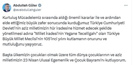 Abdullah Güler, mesajının sonunda tüm çocukların ve milletin bayramını tebrik ederek, “Başta ülkemizin çocukları olmak üzere tüm dünya çocuklarının ve aziz milletimizin 23 Nisan Ulusal Egemenlik ve Çocuk Bayramı’nı kutluyorum” ifadelerini kullandı.