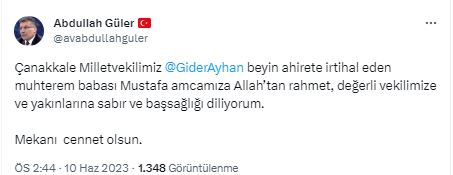 Güler paylaşımında: " Çanakkale Milletvekilimiz Ayhan Gider beyin ahirete irtihal eden muhterem babası Mustafa amcamıza Allah’tan rahmet, değerli vekilimize ve yakınlarına sabır ve başsağlığı diliyorum. Mekanı cennet olsun." ifadelerine yer verdi. (Halil Yavuz Canpolat)