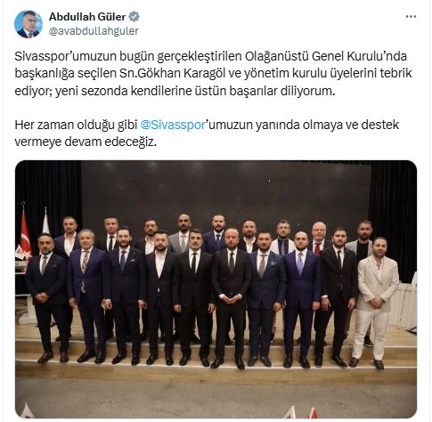 Sosyal medya hesabından açıklama yapan Güler, “Sivasspor’umuzun bugün gerçekleştirilen Olağanüstü Genel Kurulu’nda başkanlığa seçilen Sn. Gökhan Karagöl ve yönetim kurulu üyelerini tebrik ediyor; yeni sezonda kendilerine üstün başarılar diliyorum” ifadelerine yer verdi.