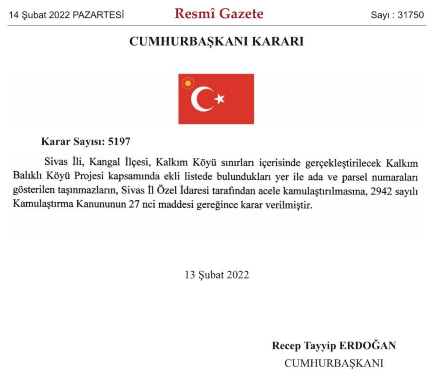 Sivas'ın vizyon projeleri arasında yer alan ve asırlar boyu konuşulacak olan bir projede çok önemli bir adım daha geride kaldı. Cumhurbaşkanı Recep Tayyip Erdoğan imzası ile Kalkım Köyü sınırları için acele kamulaştırma kararı çıktı.