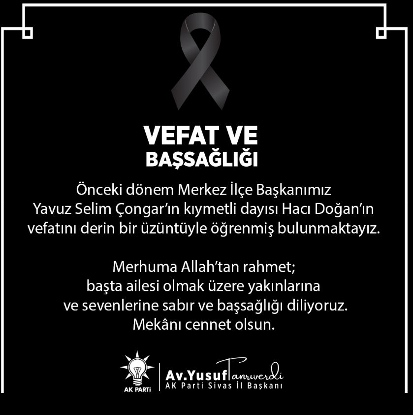 Acı Haberi AK Parti Sivas İl Başkanı Yusuf Tanrıverdi Duyurdu.. AK Parti Sivas İl Başkanı Yusuf Tanrıverdi, yayımladığı taziye mesajıyla önceki dönem Merkez İlçe Başkanı Yavuz Selim Çongar’ın dayısı Hacı Doğan’ın hayatını kaybettiğini duyurdu.