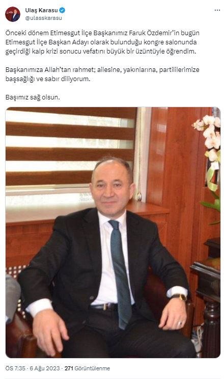CHP Sivas Milletvekili Ulaş Karasu sosyal medya hesabından yaptığı paylaşımda: "Önceki dönem Etimesgut İlçe Başkanımız Faruk Özdemir’in bugün Etimesgut İlçe Başkan Adayı olarak bulunduğu kongre salonunda geçirdiği kalp krizi sonucu vefatını büyük bir üzüntüyle öğrendim. Başkanımıza Allah’tan rahmet; ailesine, yakınlarına, partililerimize başsağlığı ve sabır diliyorum. Başımız sağ olsun." ifadelerine yer verdi. (Haber Merkezi)