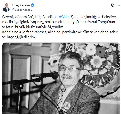 Ulaş Karasu paylaşımında, “Geçmiş dönem Sağlık-İş Sendikası Sivas Şube başkanlığı ve belediye meclis üyeliğimizi yapmış, parti emektarı büyüğümüz Yusuf Topçu’nun vefatını büyük bir üzüntüyle öğrendim. Kendisine Allah’tan rahmet, ailesine, partimize ve tüm sevenlerine sabır ve başsağlığı dilerim” ifadelerine yer verdi.
